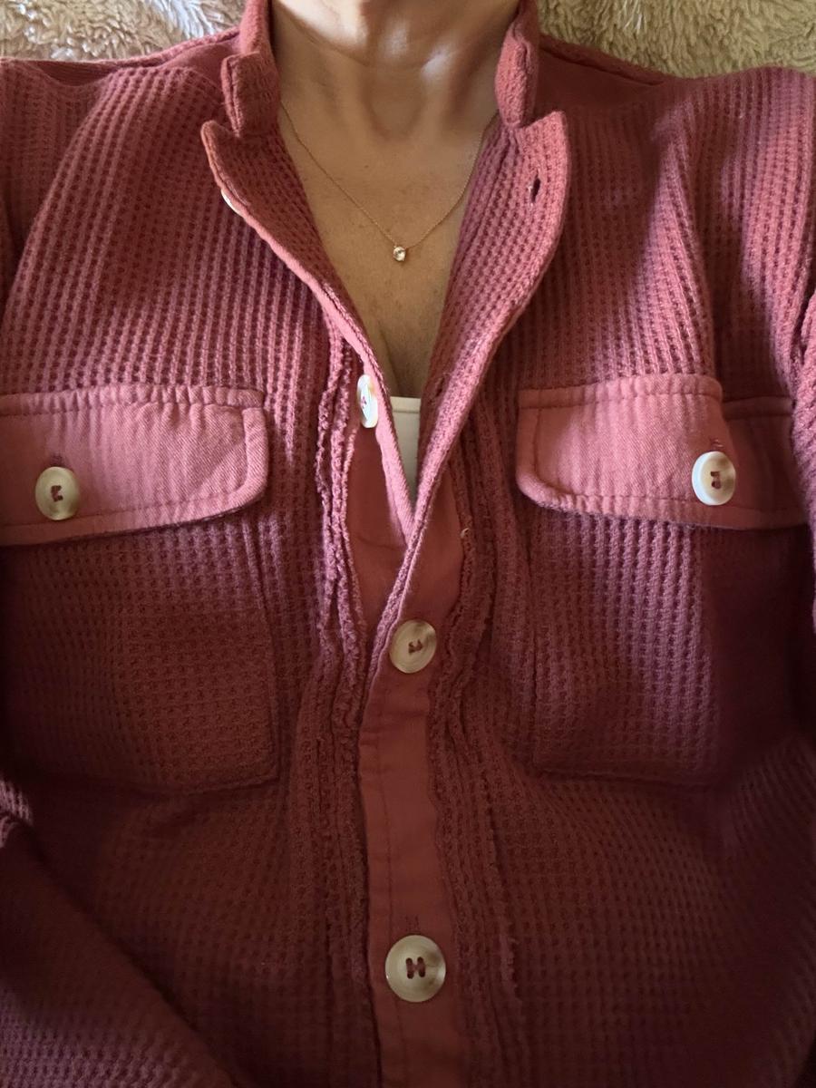 Es perfecta para los días frescos. Me gusta que tiene un corte suelto pero favorecedor. Además, los botones y el bolsillo frontal le dan un toque muy moderno.