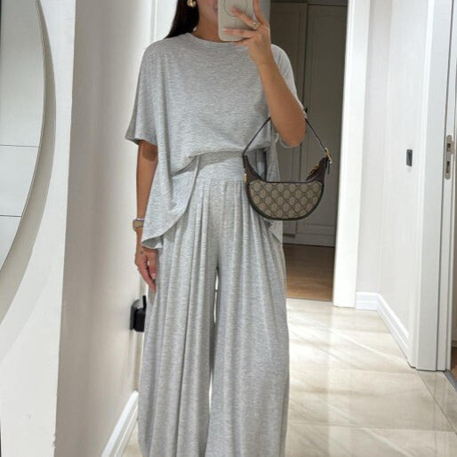 Un conjunto de dos piezas en tono gris claro, ideal para un look moderno y sofisticado.