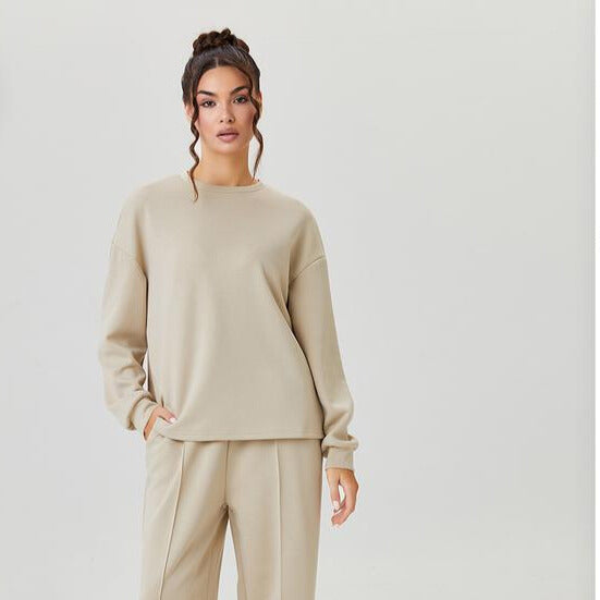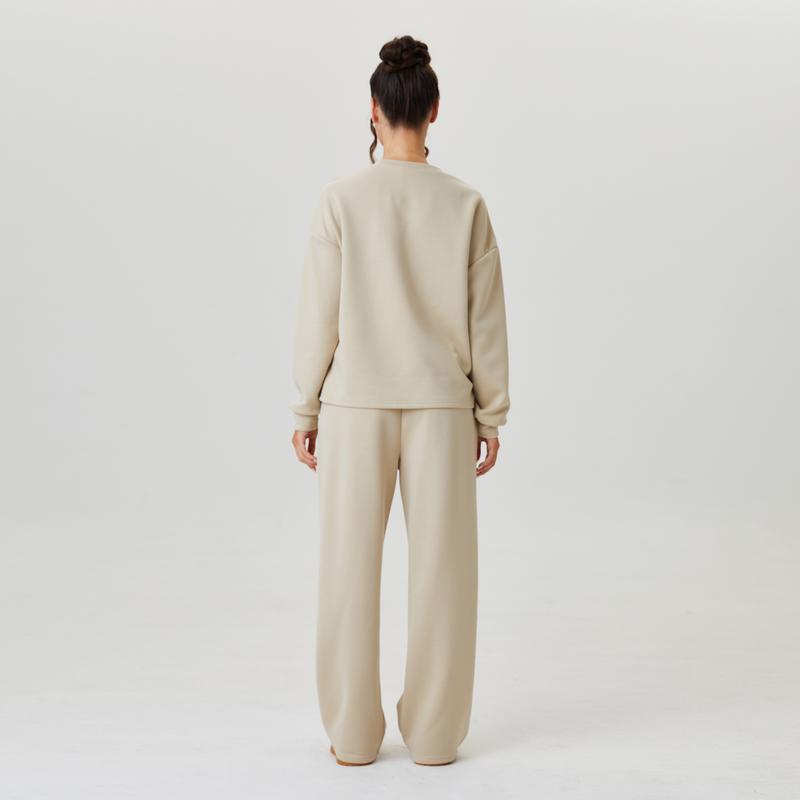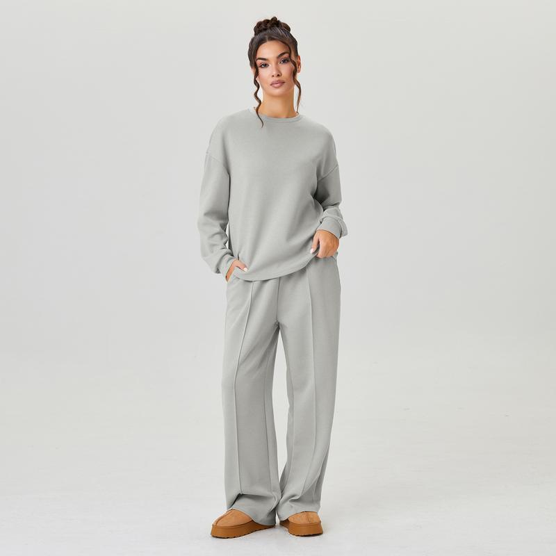 Corte holgado y favorecedor: La sudadera de ajuste relajado y los pantalones de pierna ancha crean una silueta fluida que estiliza cualquier figura.