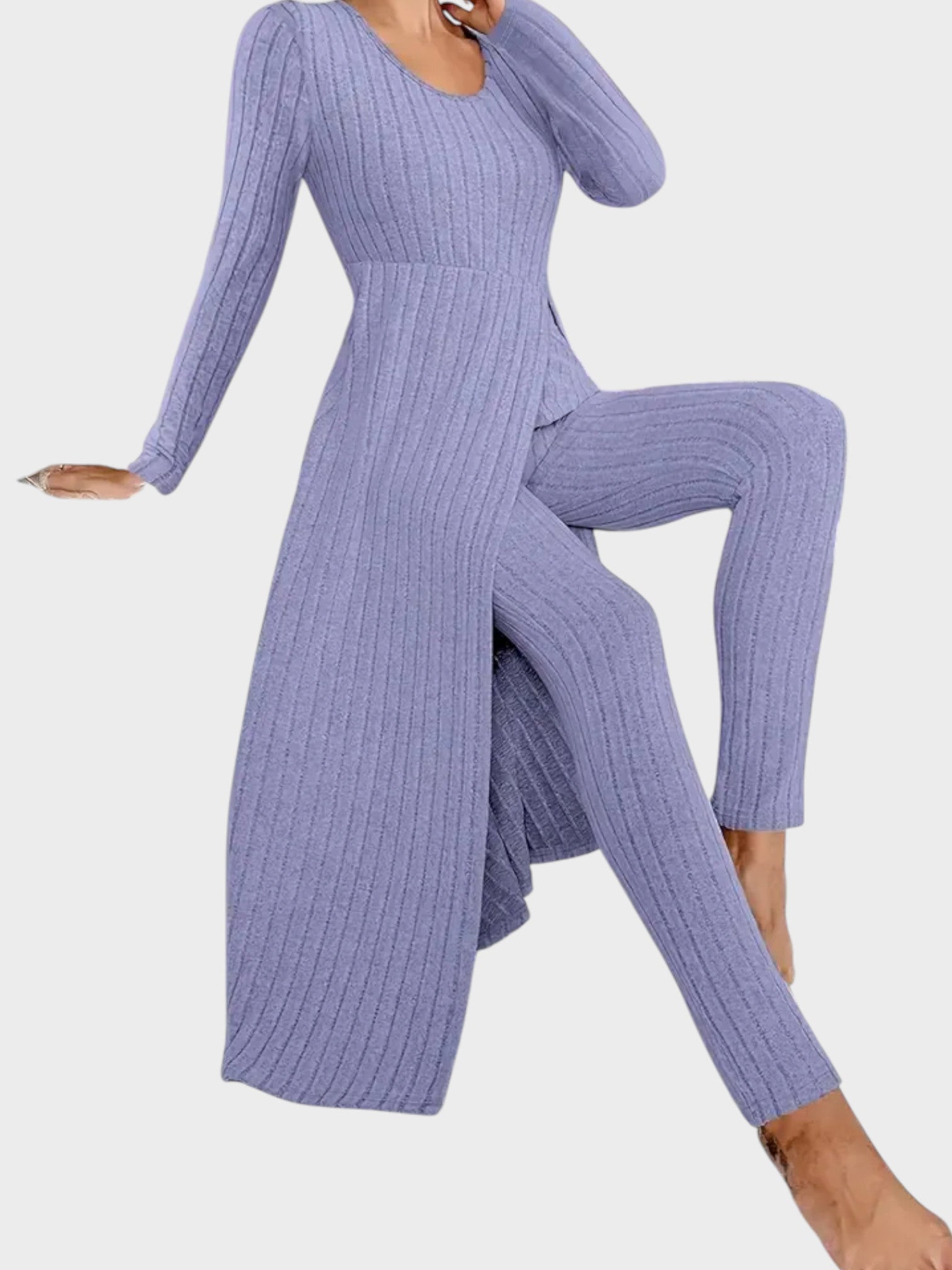 Me encantó cómo la túnica larga disimula las zonas que prefiero no marcar, dándome mucha seguridad. El tejido es suave, no se transparenta nada y el color lavanda es precioso; me hace sentir arreglada incluso estando en casa.